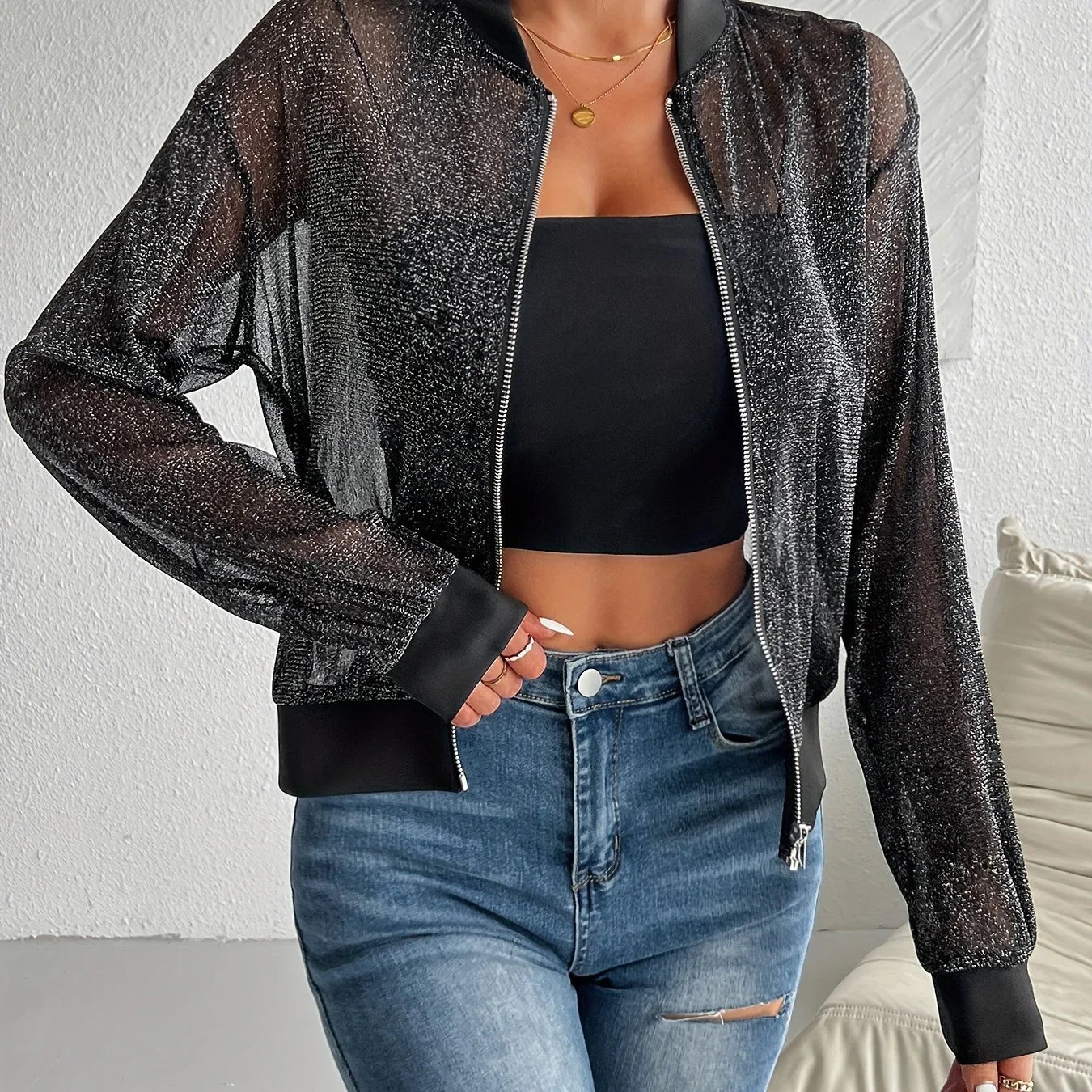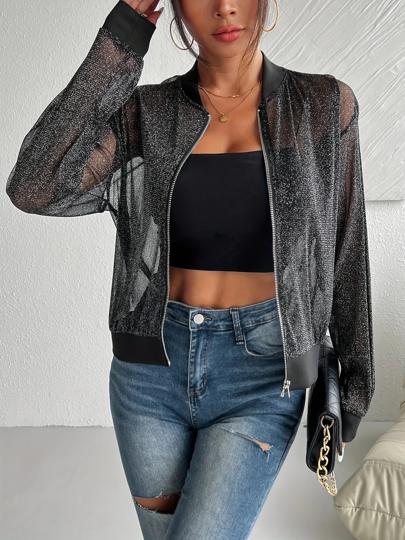 Dames bomberjack | Zwart mesh jas met glitter en rits