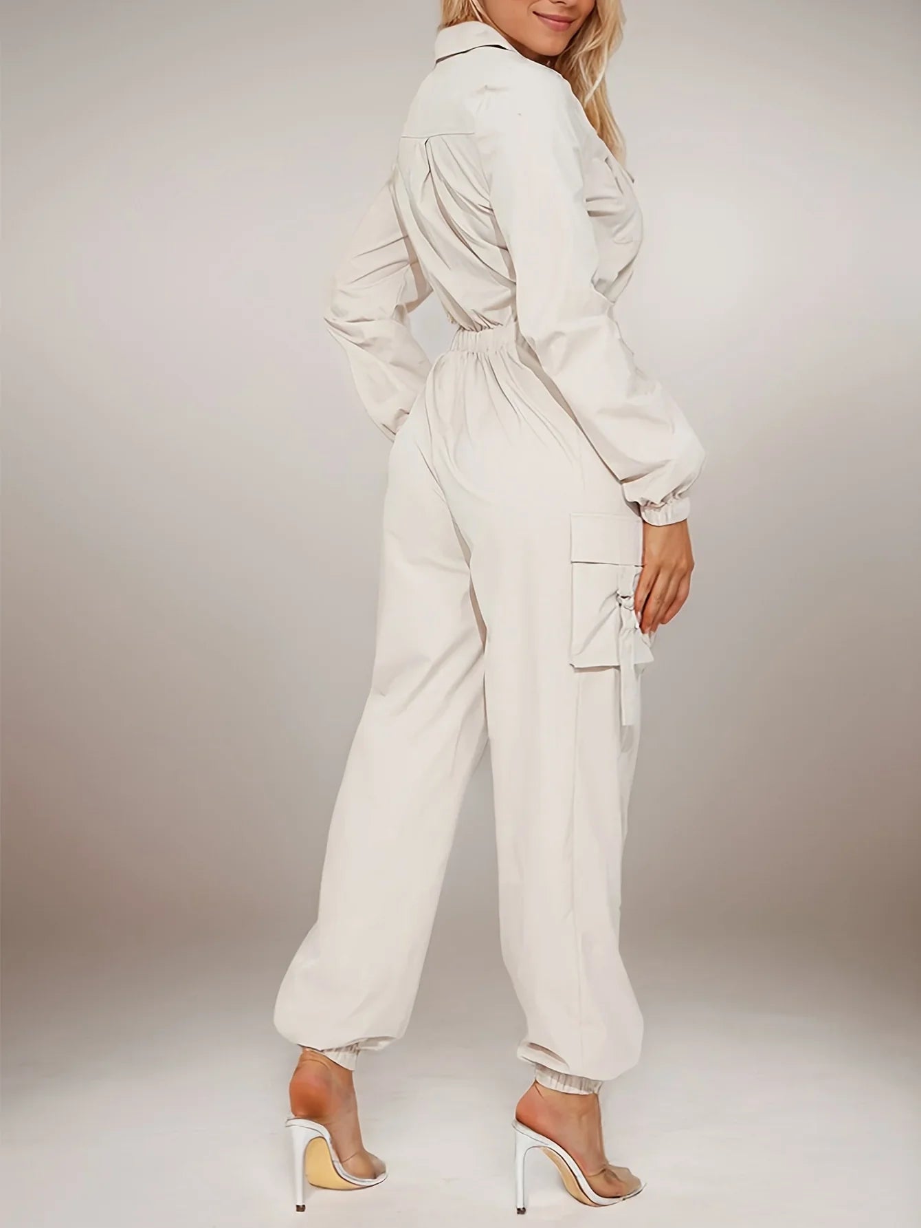 1pc vrouwen casual polyester jumpsuit met klepzakken, elastische taille en taps toelopende zoom - lange mouw, reverskraag, geritste enkel, geweven     eendelig voor weekendkleding 1