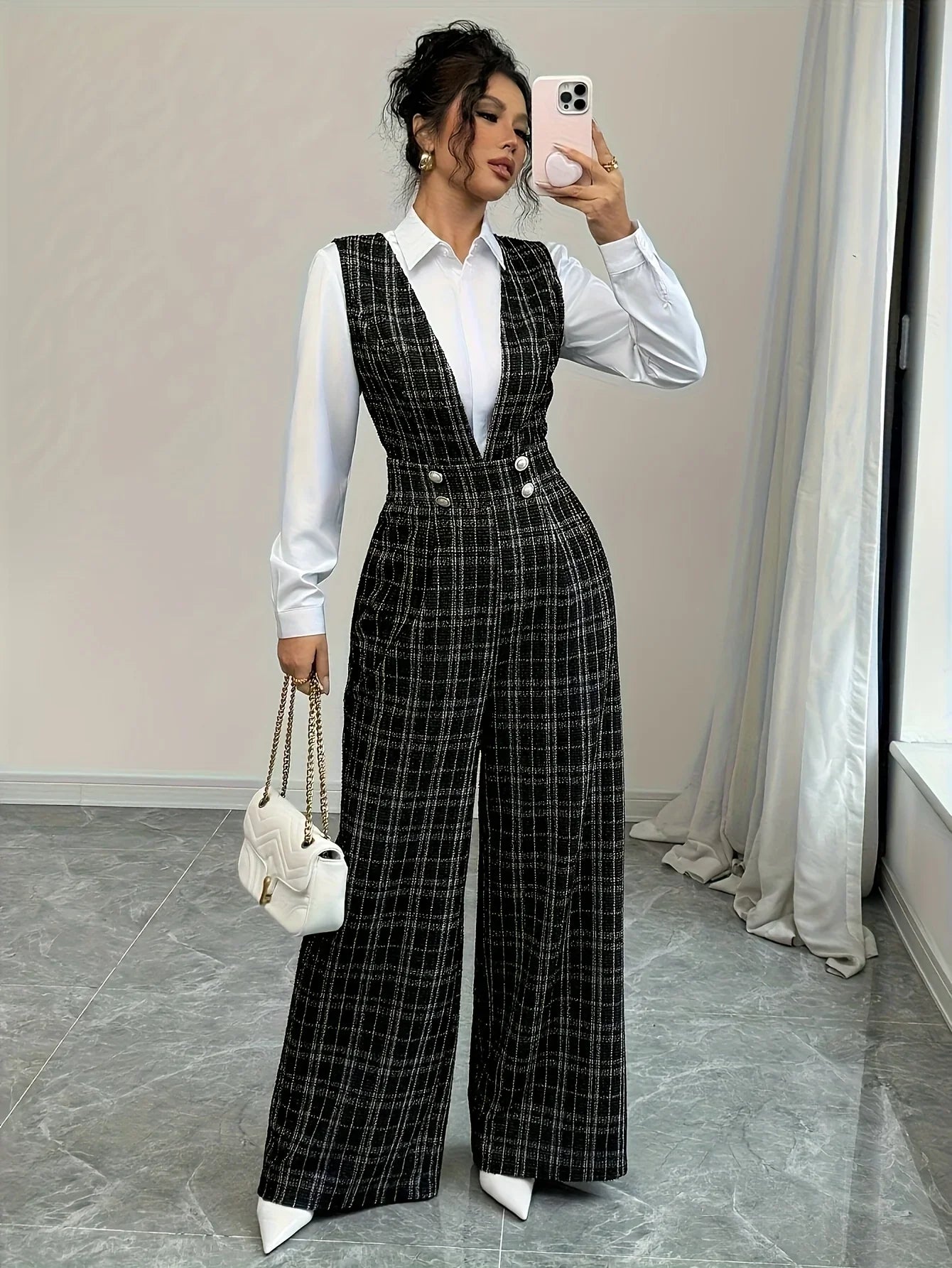 Deze dames jumpsuit met ruitpatroon is jouw nieuwe go-to voor zowel formele momenten als casual dagen met flair. De diepe V-hals en wijde pijpen zorgen voor een flatterend silhouet, terwijl de subtiele parelknopen en handige zakken zorgen voor stijlvolle functionaliteit. De zwarte en witte Schotse ruit geeft het geheel een tijdloze, verfijnde uitstraling die je makkelijk combineert met hakken of sneakers.