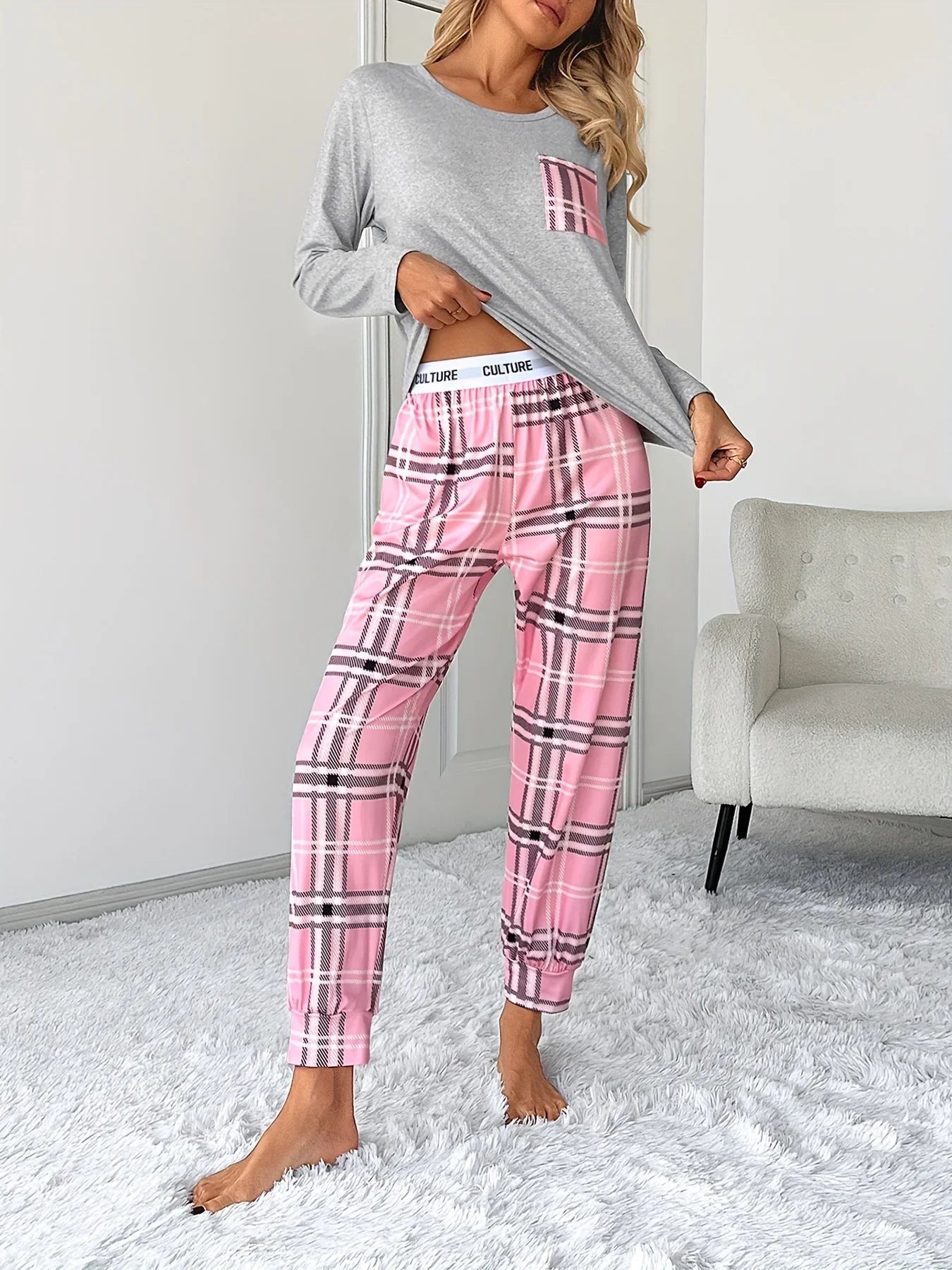 Met deze dames pyjamaset combineer je moeiteloos gezelligheid en mode. De set bestaat uit een grijs T-shirt met ronde hals en een roze geruite broek. De zachte, gebreide polyesterstof met medium stretch beweegt soepel mee en voelt licht aan, zodat je de hele nacht comfortabel slaapt. De broek heeft een praktische zak en het trendy ruitpatroon geeft je nachtkleding een frisse en moderne uitstraling. Ideaal om in te slapen, loungen of gewoon ontspannen thuis te dragen.