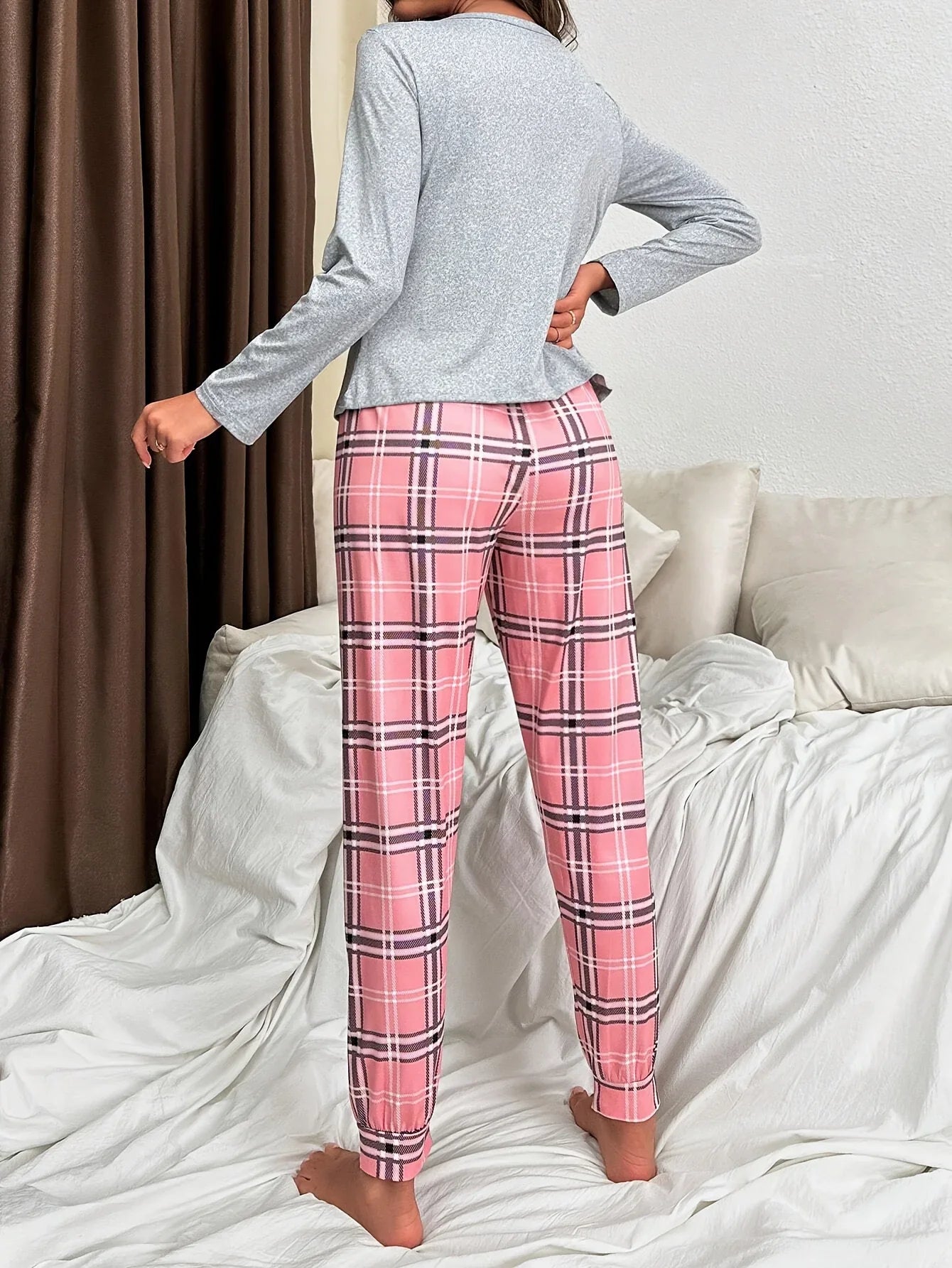 Dames pyjama set | Roze geruite broek met grijs shirt