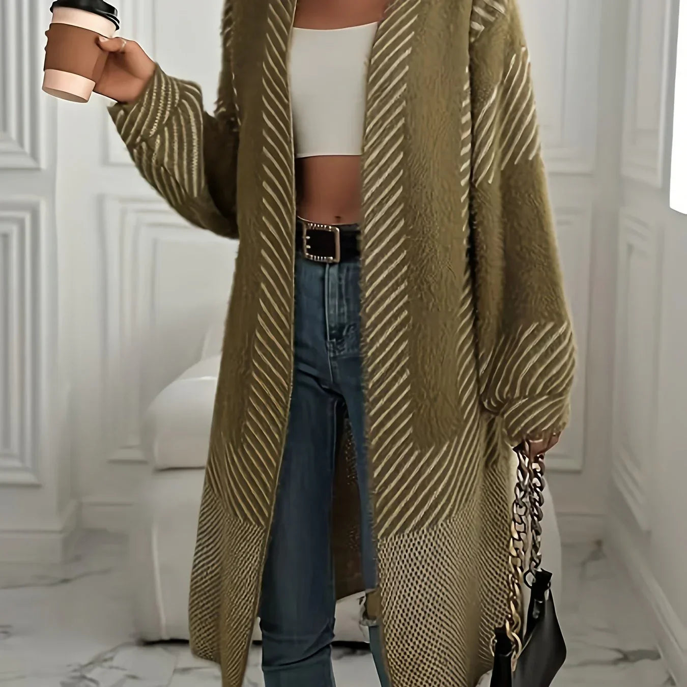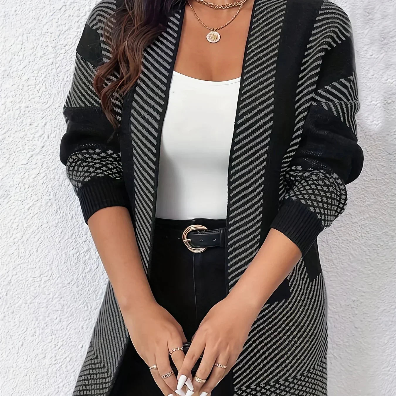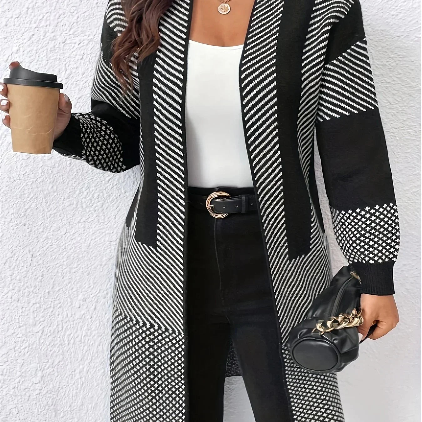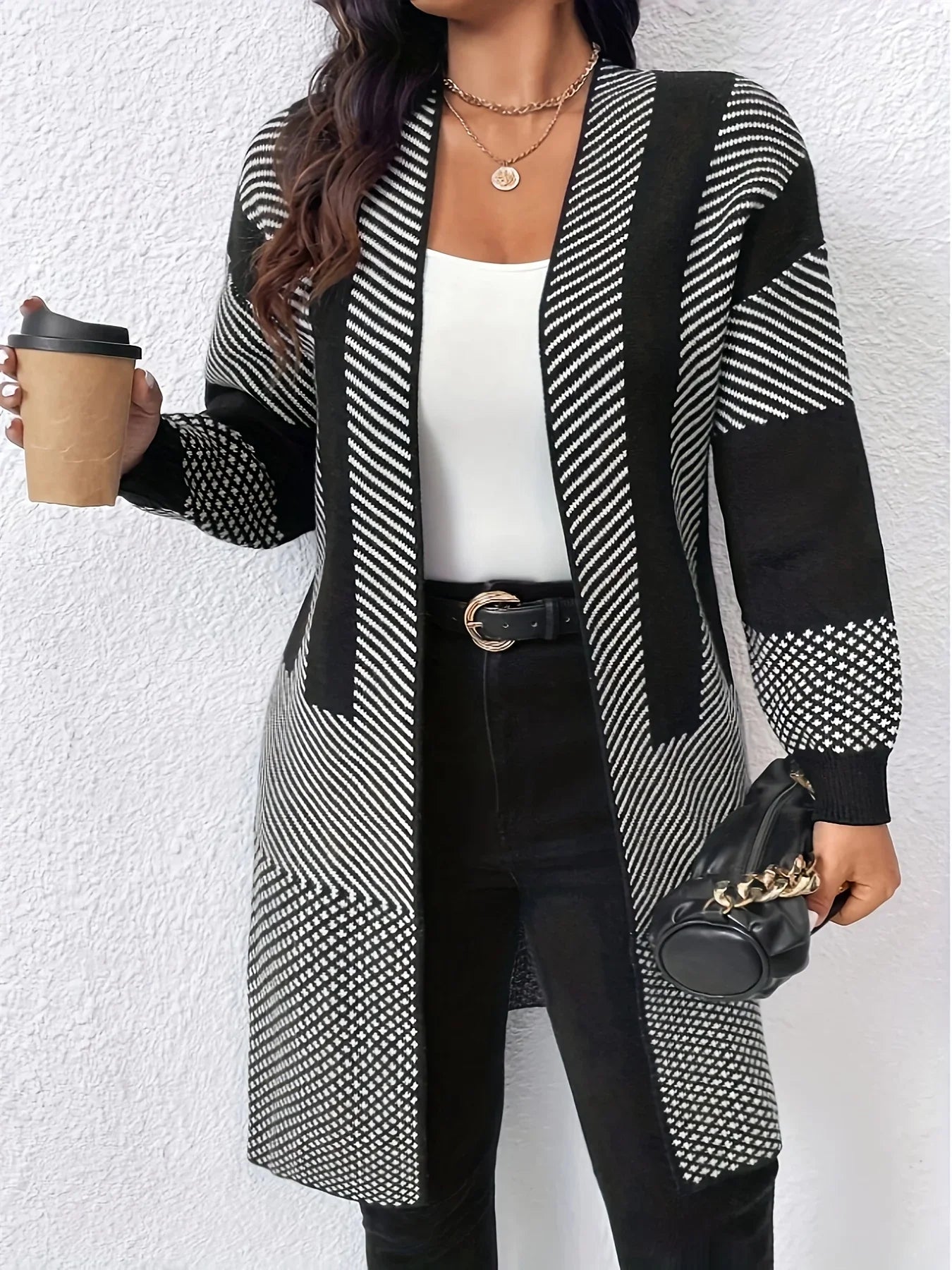 plus size, plus-size dames casual color-block vest - gestreepte  -lengte open front trui met opstaande kraag, zwart-wit visgraatpatroon, knusse herfst winter laagje,   comfortabel kledingstuk, niet-rekbaar stof 2