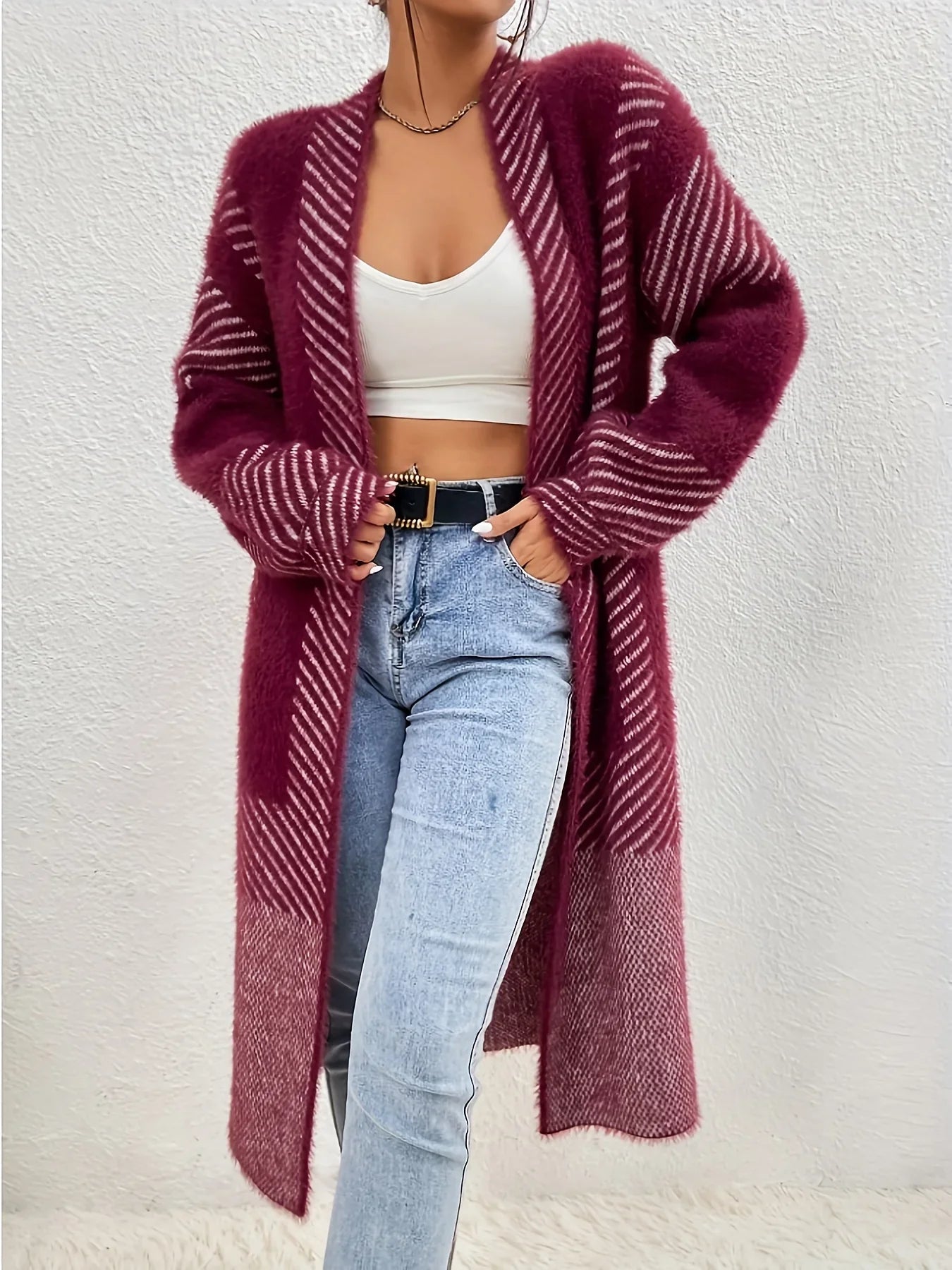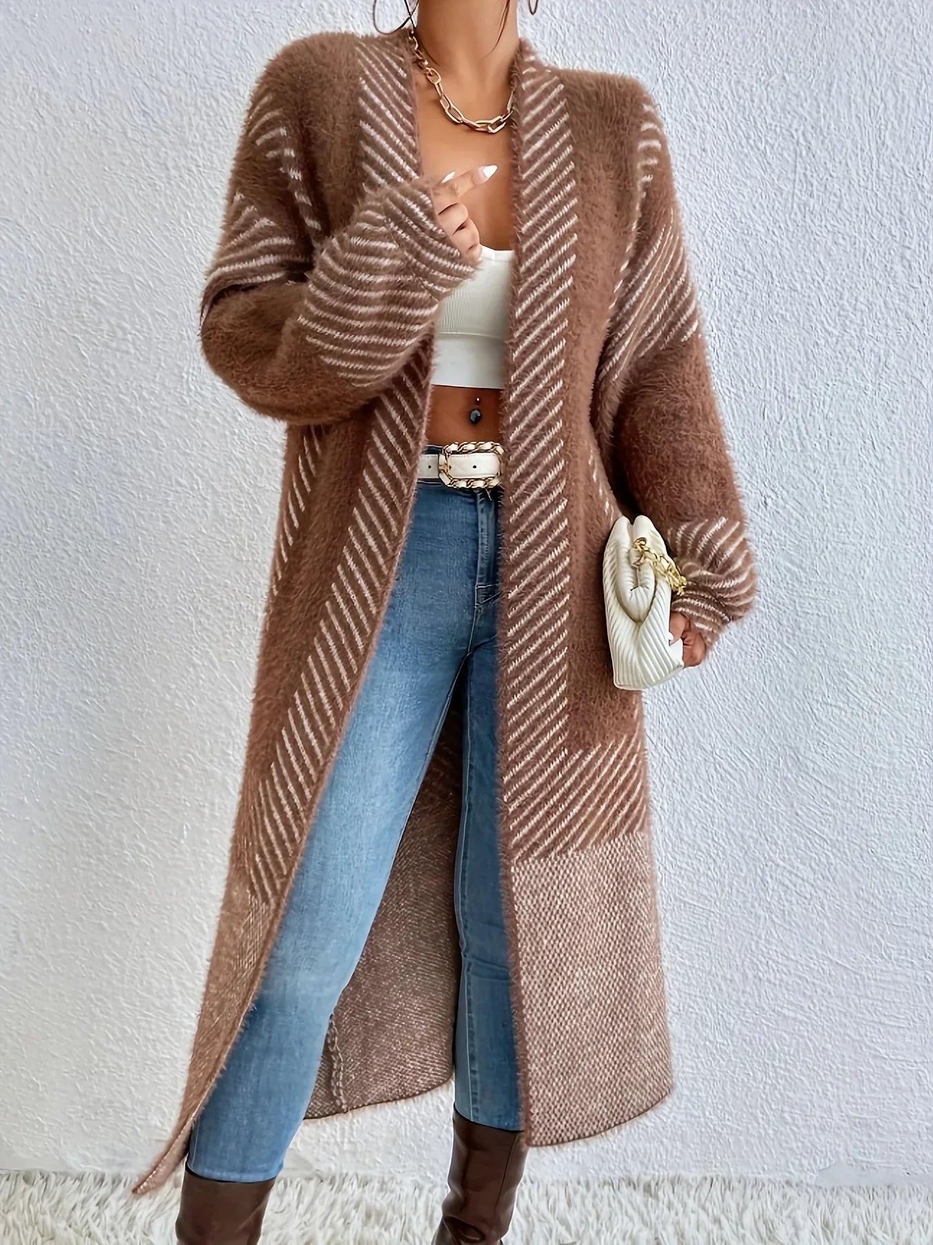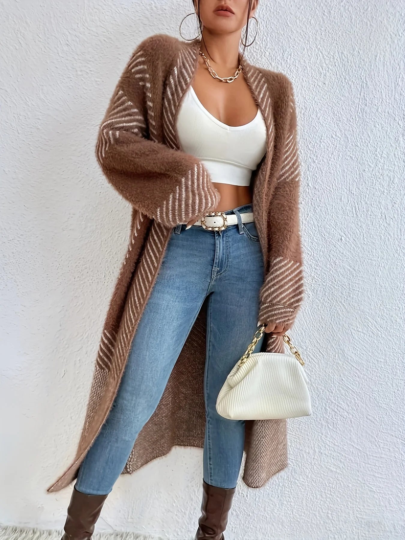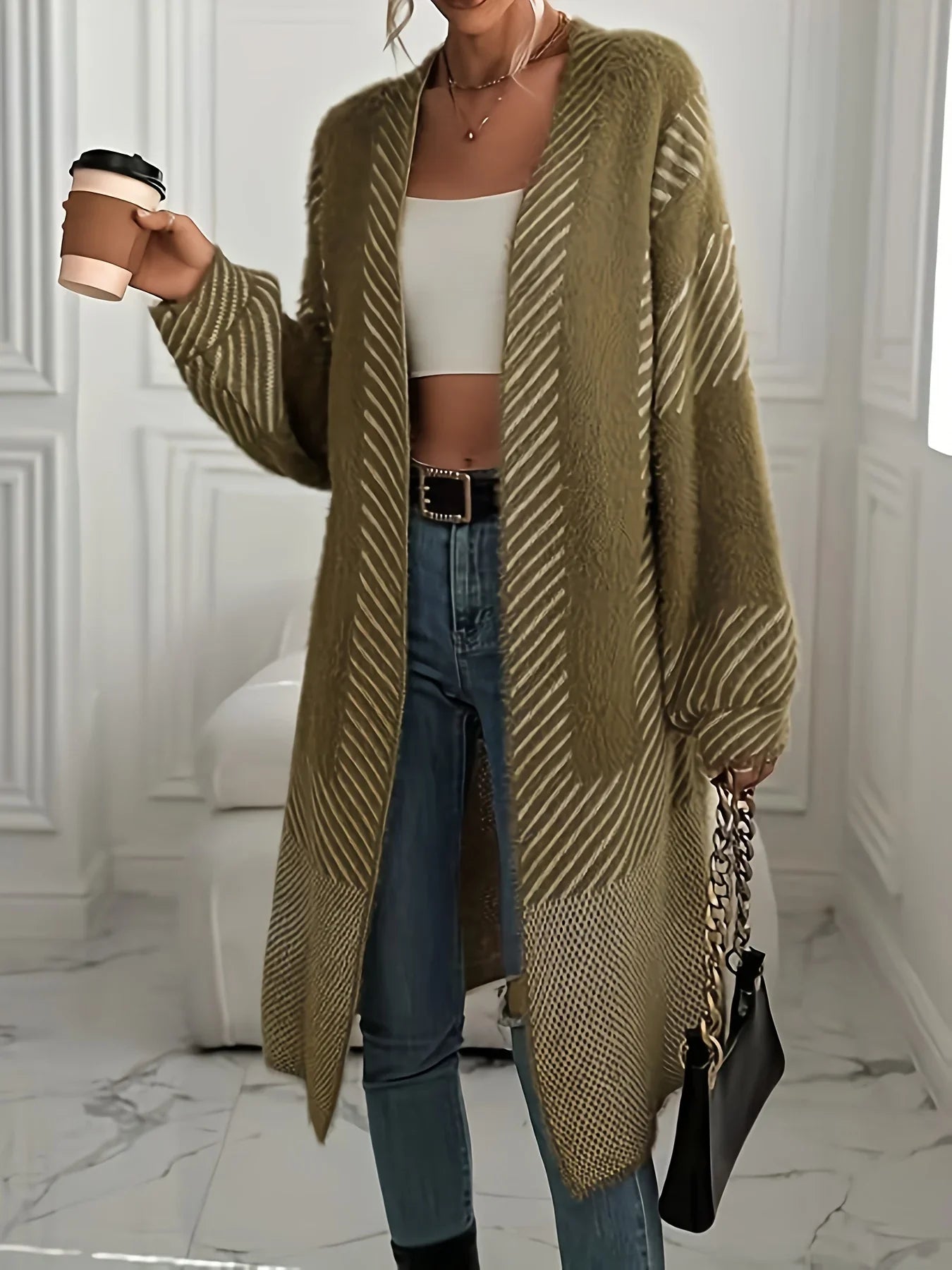 plus size, plus-size dames casual color-block vest - gestreepte  -lengte open front trui met opstaande kraag, zwart-wit visgraatpatroon, knusse herfst winter laagje,   comfortabel kledingstuk, niet-rekbaar stof 2