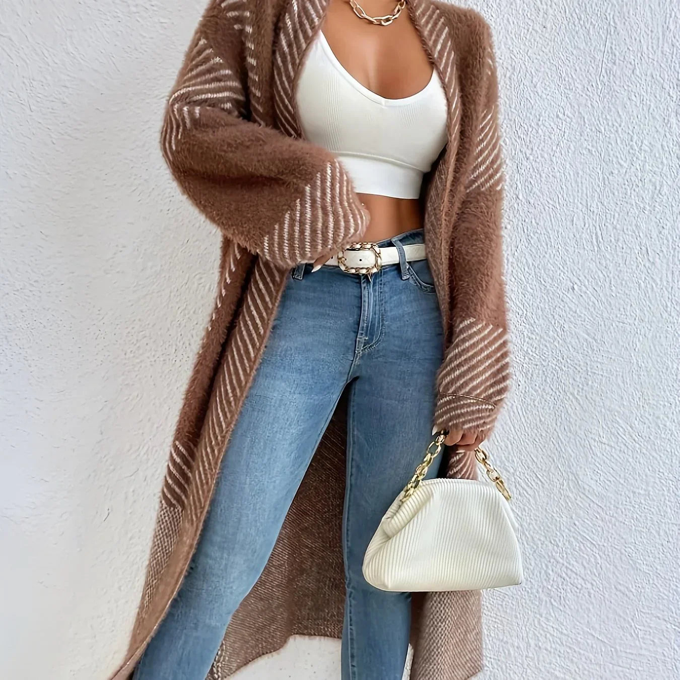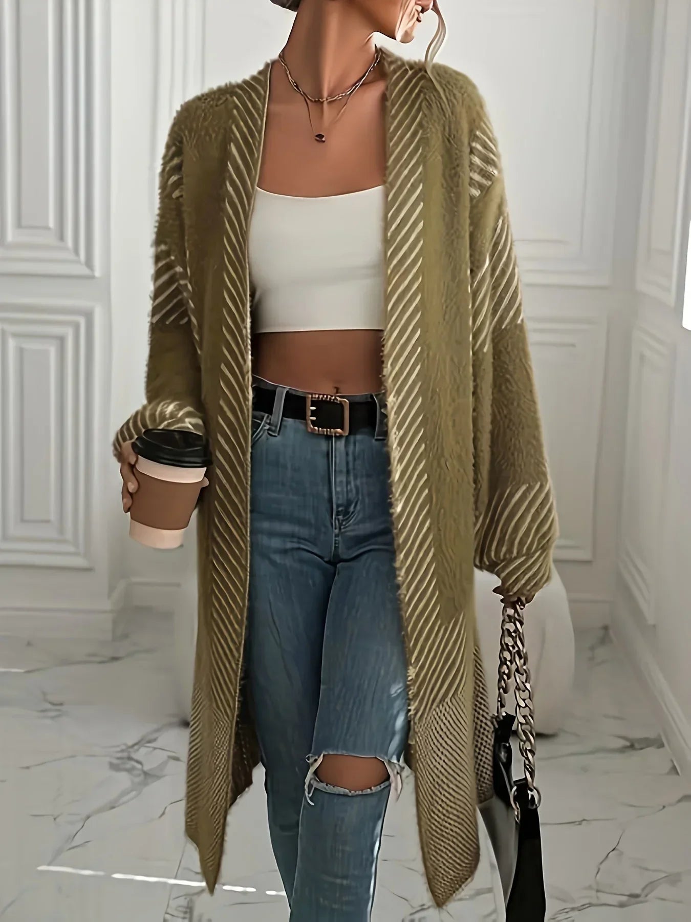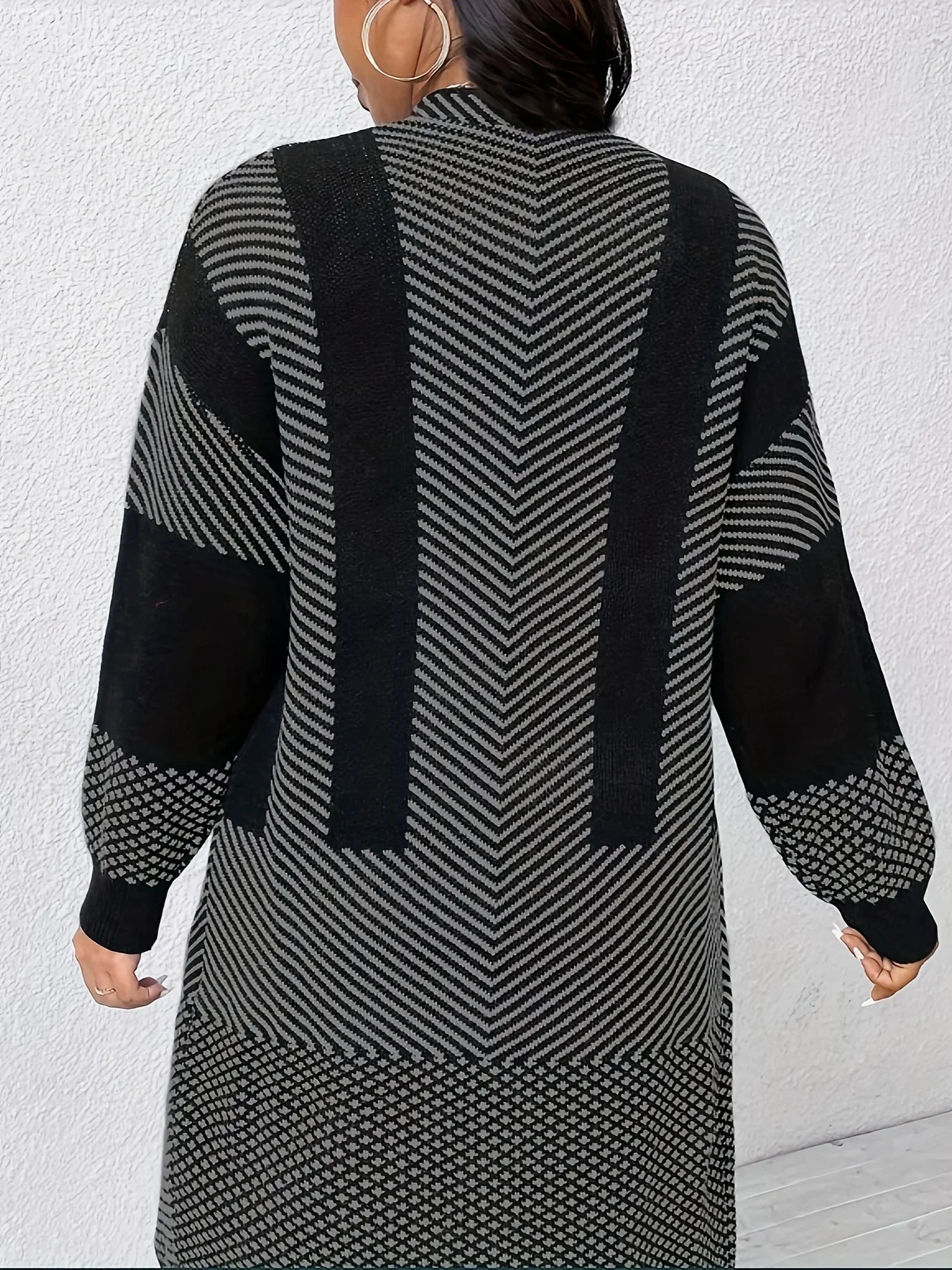 Deze lange, zwart-wit gebreide trui is een must-have voor wie houdt van opvallende eenvoud. Het openvallende ontwerp in een subtiel visgraatmotief straalt klasse uit, terwijl de opstaande kraag zorgt voor extra warmte. Perfect voor laagjes in het herfst- en winterseizoen, en ideaal voor plus size silhouetten dankzij de rechte, flatterende snit. Combineer met een basic top, jeans en boots – en je bent klaar om stijlvol op pad te gaan.