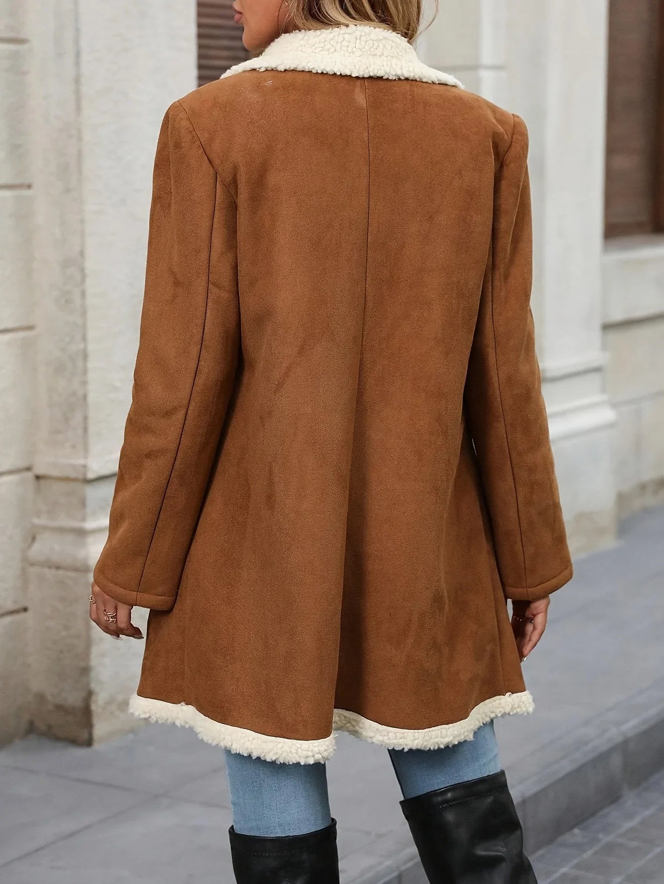 Zodra je deze bruine teddy coat aantrekt, voel je het verschil. De dikke, zachte voering houdt je heerlijk warm, terwijl het elegante design met reverskraag en dubbelrijige knopen zorgt voor een tijdloze look. Perfect voor frisse wandelingen, een dagje shoppen of onderweg naar werk – deze jas bewijst dat comfort en stijl perfect samengaan.