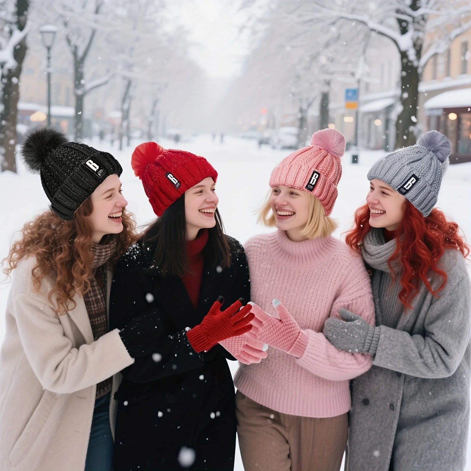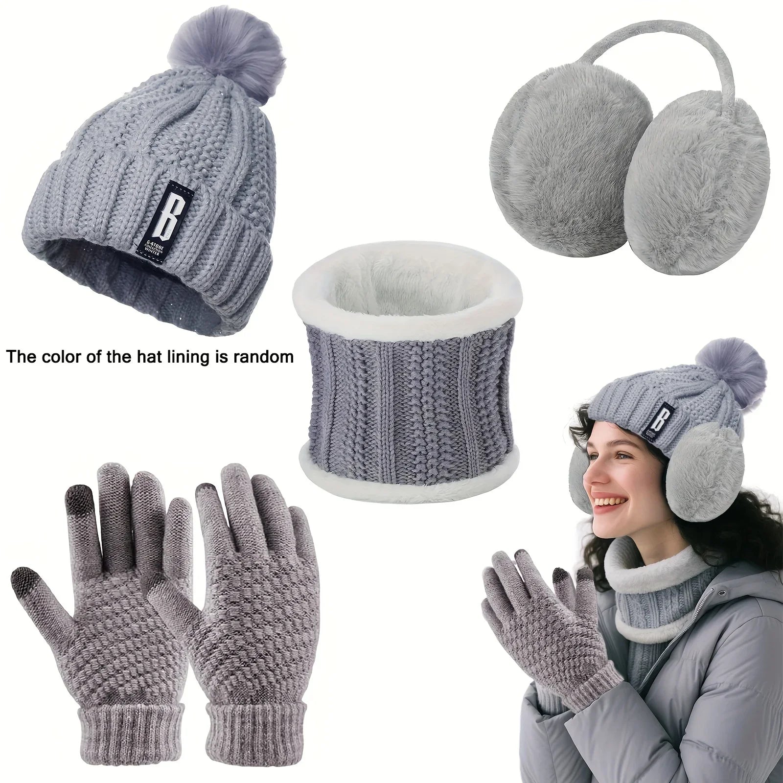 4-delige winterkostuum accessoires set voor vrouwen, gebreide thermische   met pompon, handschoenen en nekwarmer, warme accessoires set voor buiten in sneeuwweer 4