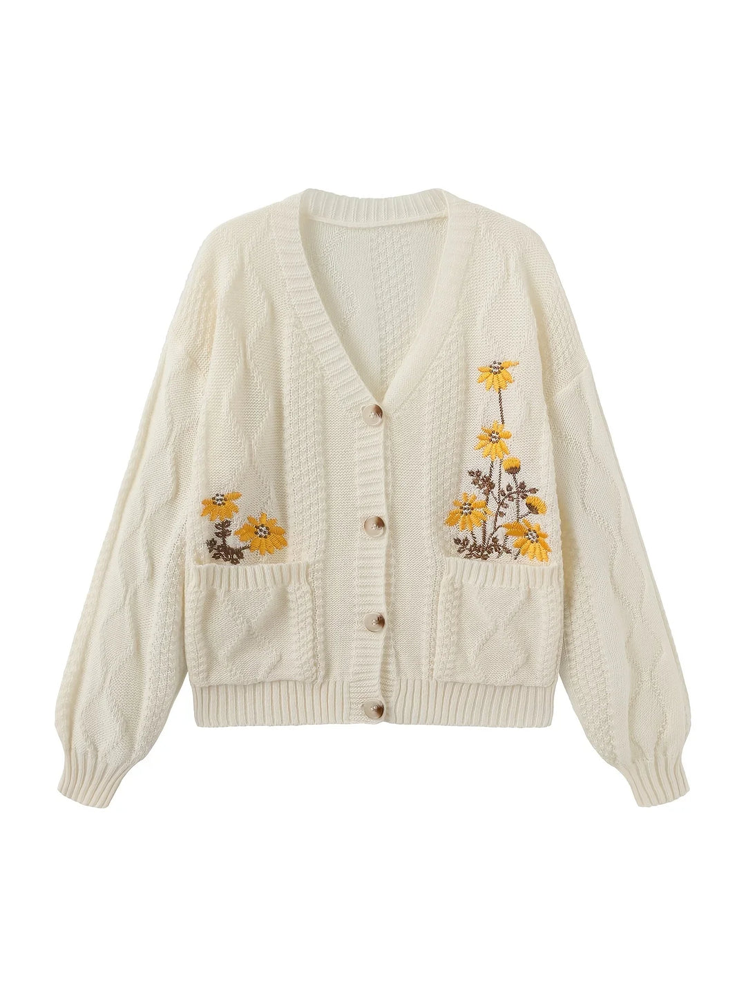 Dames vest | Gebreide trui met bloemenborduursel en knopen
