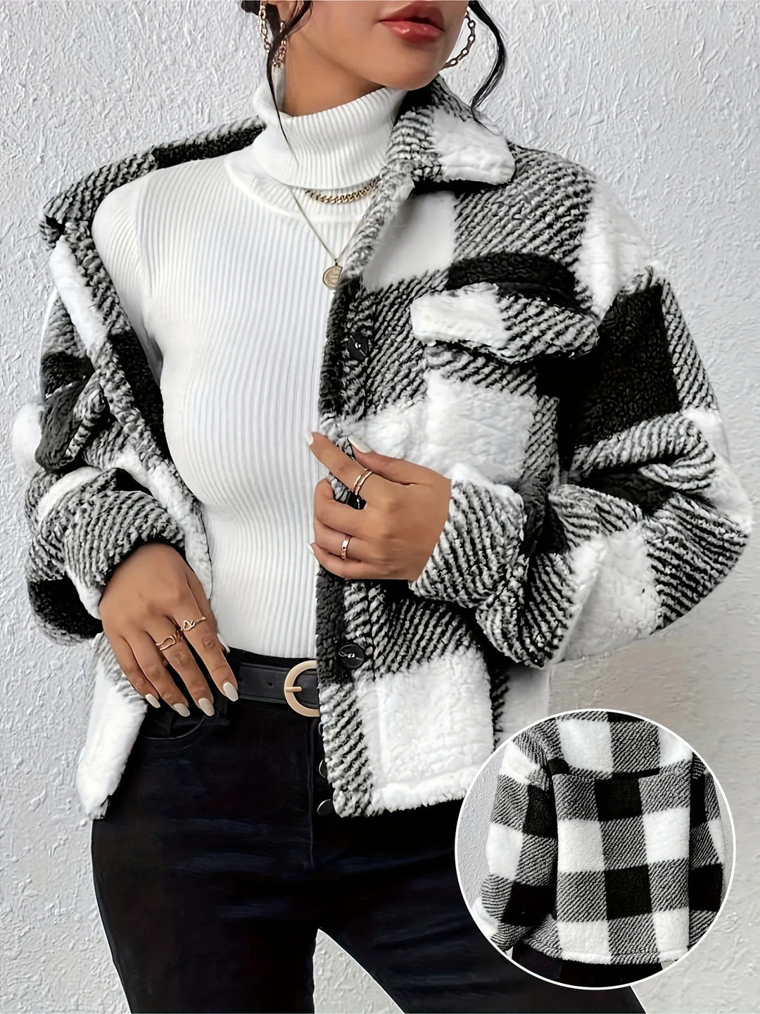 Dames teddy jas | Zwart wit ruitprint tussenjas met knopen