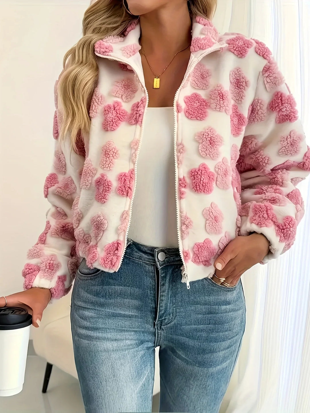 Dames teddy bomberjack | Wit roze jas met bloemenstructuur en rits