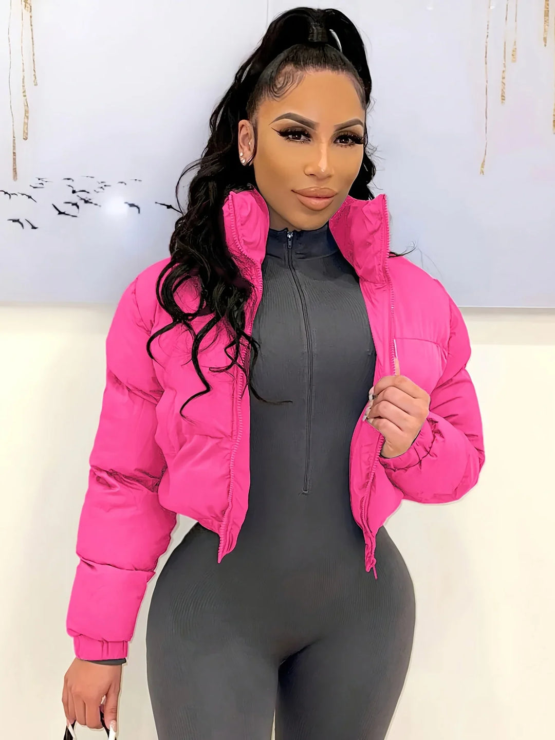 Dames puffer bomberjack | Felroze gewatteerde winterjas kort model