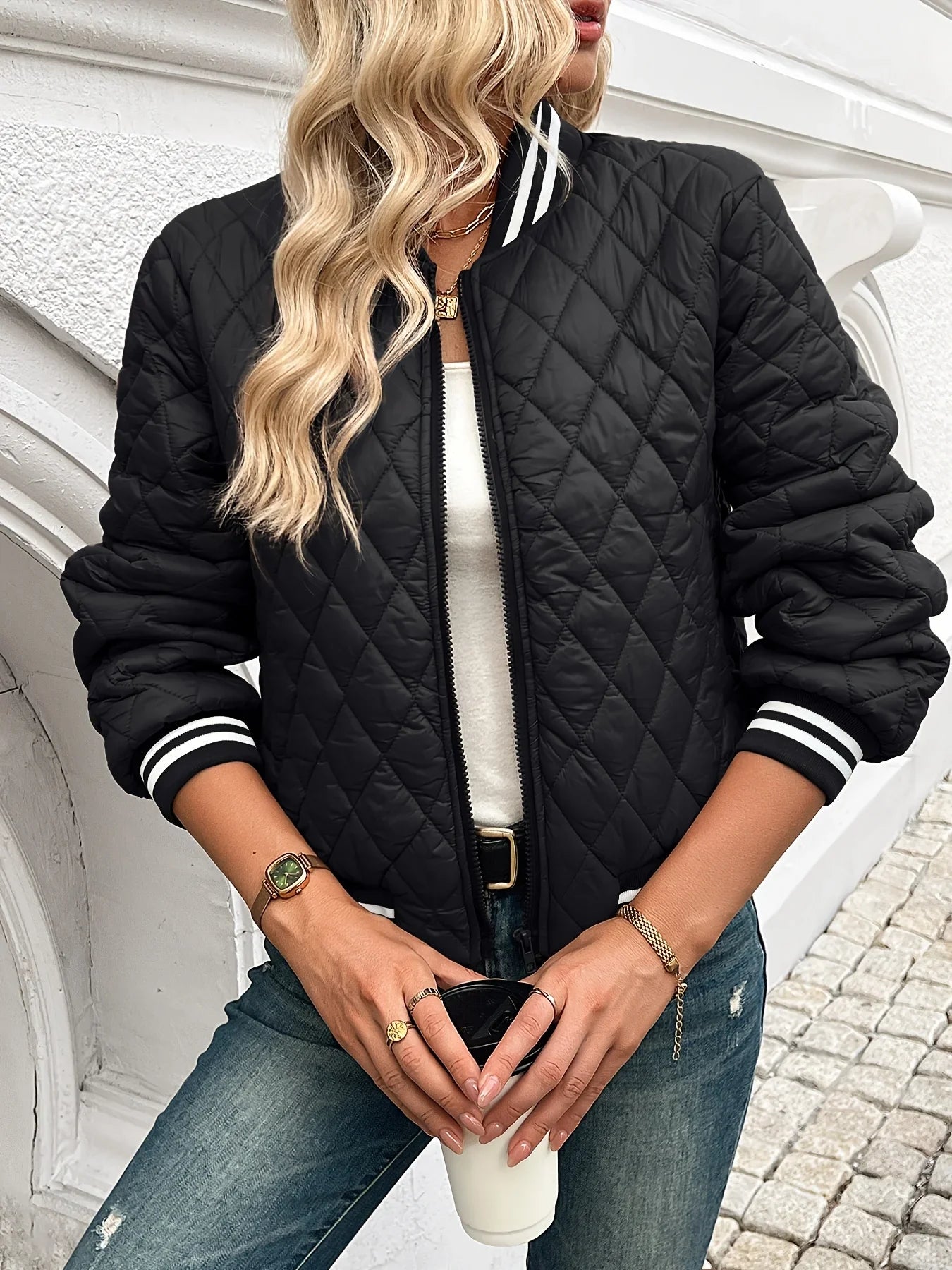 Voel de zachte gewatteerde voering en ervaar direct de warme omhelzing van stijl en comfort. Deze korte bomberjack, met zijn opvallende zwart-witte contrast en klassieke quilted look, tilt je wintergarderobe naar een hoger niveau. Licht van gewicht, maar zwaar op stijl – dit is de jas die je keer op keer zult dragen.