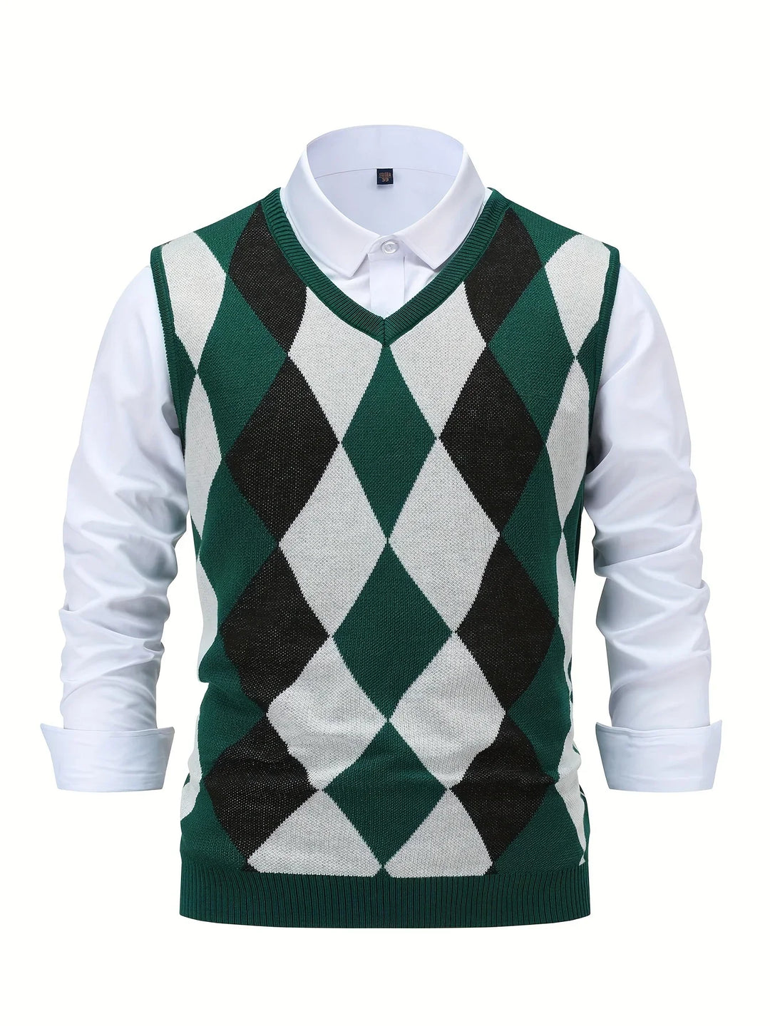 Heren pullover | Argyle gebreide trui zonder mouwen v-hals